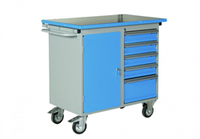 Robust mobil værktøjsvogn/arbejdsbord med massiv vinylbordplade. 5 udtræksskuffer og en skabslåge med hylde.